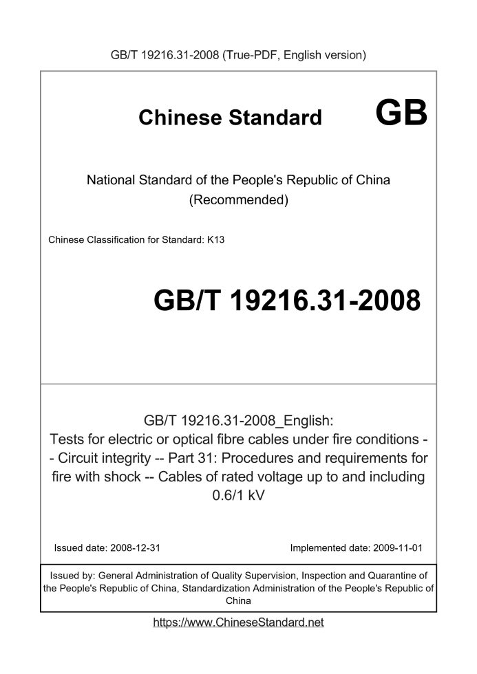 Tests for electric or optical fibre cables under fire conditions Circuit integrity Part 31.. Procedures and requirements for fire with shock Cables of rated voltage up to and including 0.6/1 kV ICS 29.060.20 K13 National Standards of People's Republic of China GB/T 19216.31-2008/IEC 60331-31.2002 Circuit integrity under fire conditions in electric cables - Part 31. for fire with shock - Test procedure and requirements --- Rated voltage 0.6/1 and the following cables k Vp (IEC 60331-31.2002, Testsforelectriccablesunderfireconditions- Circuitintegrity-Part 31. Proceduresandrequirementsforfirewithshock- Cablesofratedvoltageuptoandincluding0.6/1kV, IDT) Posted 2008-12-31 2009-11-01 implementation Administration of Quality Supervision, Inspection and Quarantine of People's Republic of China Standardization Administration of China released
