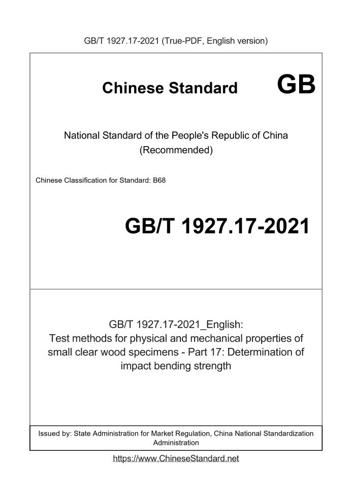 Delivery: <= 3 days. True-PDF full-copy in English will be manually translated and delivered via email. GB/T 1927.17-2021: Test methods for physical and mechanical properties of small clear wood specimens - Part 17: Determination of impact bending strength Status: Valid