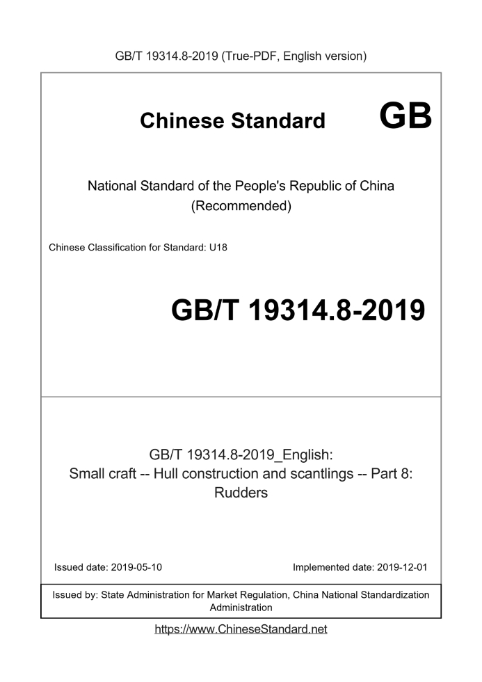 Delivery: <= 5 days. True-PDF full-copy in English will be manually translated and delivered via email. GB/T 19314.8-2019: Small craft -- Hull construction and scantlings -- Part 8: Rudders Status: Valid