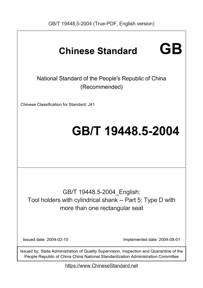 Delivery: <= 3 days. True-PDF full-copy in English will be manually translated and delivered via email. GB/T 19448.5-2004: Tool holders with cylindrical shank -- Part 5: Type D with more than one rectangular seat Status: Valid
