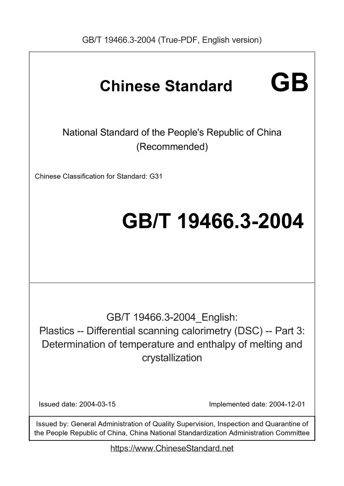 Delivery: <= 3 days. True-PDF full-copy in English will be manually translated and delivered via email. GB/T 19466.3-2004: Plastics -- Differential scanning calorimetry (DSC) -- Part 3: Determination of temperature and enthalpy of melting and crystallization Status: Valid