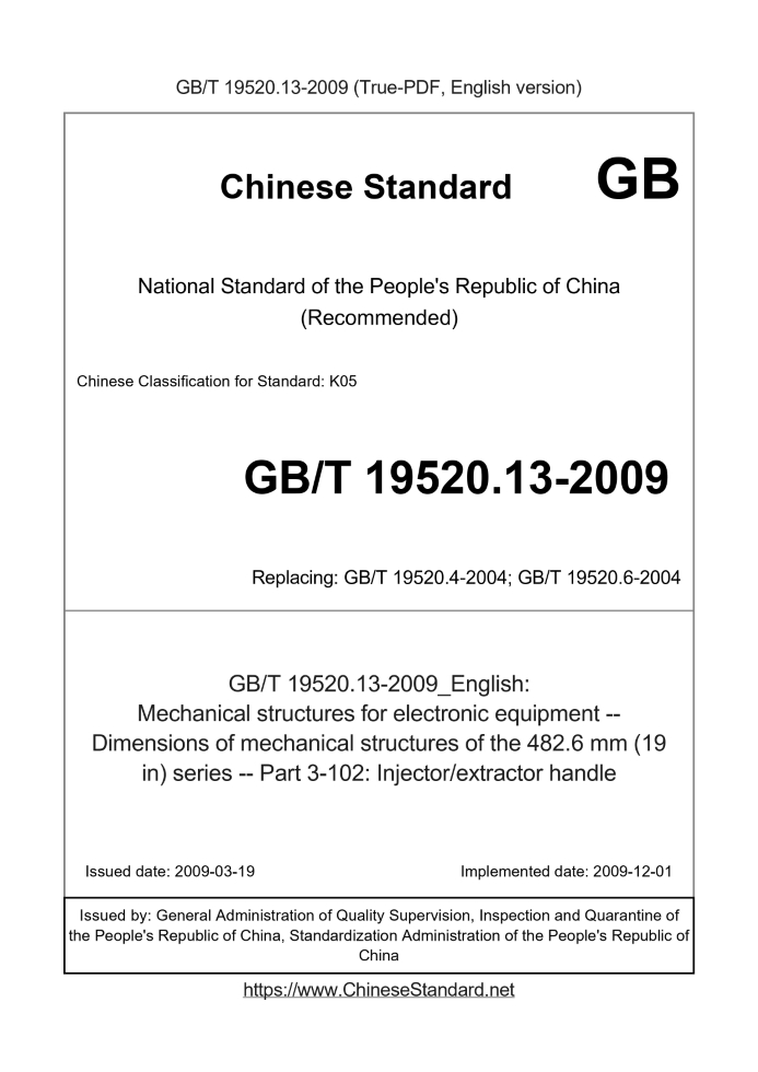 GB/T 19520.13-2009: Mechanical structures for electronic equipment -- Dimensions of mechanical structures of the 482.6 mm (19 in) series -- Part 3-102: Injector/extractor handle