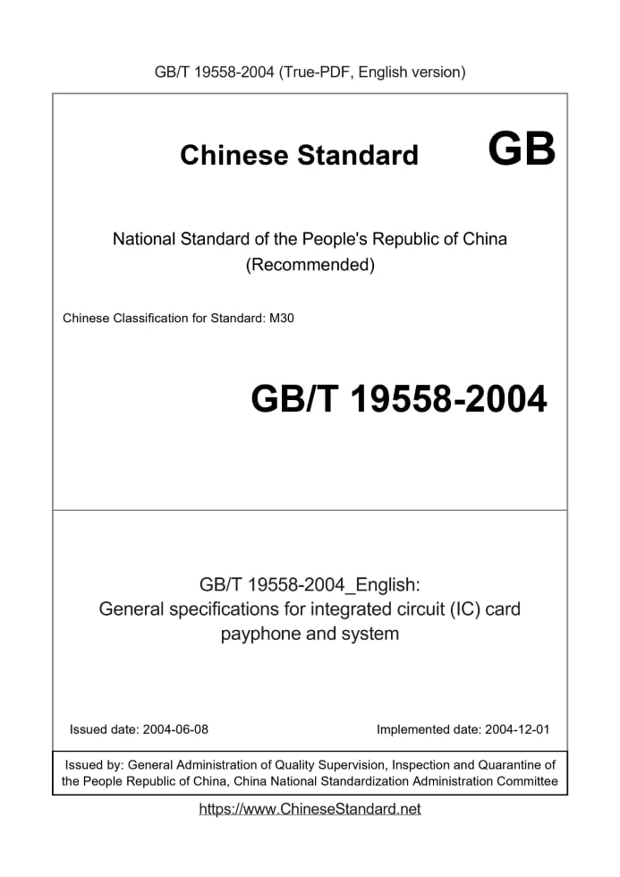 Delivery: <= 13 days. True-PDF full-copy in English will be manually translated and delivered via email. GB/T 19558-2004: General specifications for integrated circuit (IC) card payphone and system Status: Valid