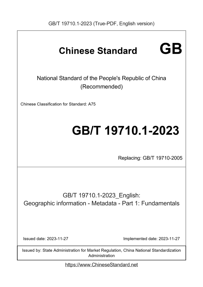 Basic dataStandard ID: GB/T 19710.1-2023 (GB/T19710.1-2023)Description (Translated English): Geographic information - Metadata - Part 1: Fundamentals Sector / Industry: National Standard (Recommended) Classification of Chinese Standard: A75 Classification of International Standard: 07.040, 35.240.70 Word Count Estimation: 159,118 Date of Issue: 2023-11-27 Date of Implementation: 2023-11-27 Older Standard (superseded by this standard): GB/T 19710-2005 Issuing agency(ies): State Administration for Market Regulation, China National Standardization Administration GB/T 19710.1-2023: Geographic information - Metadata - Part 1: Fundamentals---This is a DRAFT version for illustration, not a final translation. Full copy of true-PDF in English version (including equations, symbols, images, flow-chart, tables, and figures etc.) will be manually/carefully translated upon your order.ICS 07:040;35:240:70 CCSA75 National Standards of People's Republic of China Replace GB/T 19710-2005 Geographic Information Metadata Part 1: Basics (ISO 19115-1:2014,MOD) Published on 2023-11-27 Implemented on 2023-11-27 State Administration for Market Regulation Released by the National Standardization Administration Committee Table of contentsPreface III Introduction V 1 Scope 1 2 Normative references 1 3 Terms and Definitions 2 4 Symbols and abbreviations 4 4:1 Abbreviations 4 4:2 Package abbreviation 4 5 Consistency 4 5:1 Conformance requirements 4 5:2 Abstract test suite 4 6 Metadata requirements 5 6:1 Resource metadata 5 6:2 Metadata application information 5 6:3 Metadata base packages and dependencies 5 6:4 Relationship between citation and responsible unit information package, metadata application information package and coverage information package 6 6:5 Class diagram of resource metadata package 7 6:6 Coverage, References and General Information Package 20 6:7 Implementation Example 23 6:8 Metadata implementation 23 6:9 Discovering metadata 23 6:10 Revision 23 Appendix A (Normative) Abstract Test Suite 24 Appendix B (Normative) Data Dictionary 26 Appendix C (Normative) Metadata Extensions and Specific Standards 114 Appendix D (Informative) Implementation Example 117 Appendix E (Informative) Metadata Implementation 130 Appendix F (normative) Geographical resource discovery metadata 137 Appendix G (informative) Revision Notes 140 Reference 151ForewordThis document complies with the provisions of GB/T 1:1-2020 "Standardization Work Guidelines Part 1: Structure and Drafting Rules of Standardization Documents" Drafting: This document is Part 1 of GB/T 19710 "Geographical Information Metadata": GB/T 19710 has published the following parts: ---Part 1: Basics; ---Part 2: Imagery and Grid Data Extensions: This document replaces GB/T 19710-2005 "Geographical Information Metadata": Compared with GB/T 19710-2005, except for structural adjustments and In addition to editorial changes, the main technical changes are as follows: ---Added "service metadata information" (see 6:5:14, Table B:14, E:5:8); ---Added metadata describing discovery services and non-service resources (see F:2, F:3); ---Deleted the concept of "core metadata" (see 6:5 of the:2005 version); ---Deleted the relevant content of "data quality information" (see A:2:4 and B:2:4 of the:2005 version); ---Deleted the "abbreviation" of the metadata element and the "field code" of the code (see Appendix B of the:2005 version): This document is modified to adopt ISO 19115-1:2014 "Geographical Information Metadata Part 1: Basics": Compared with ISO 19115-1:2014, this document has made the following structural adjustments: ---Chapter 2 ~ Chapter 4 correspond to Chapter 3 ~ Chapter 5 of ISO 19115-1:2014; ---Chapter 5 corresponds to Chapter 2 in ISO 19115-1:2014; ---Deleted 6:7 of ISO 19115-1:2014; 6:7~6:10 of this document correspond to 6:8~6:11 of ISO 19115-1:2014; ---Deleted B:3:11 and B:3:14 of ISO 19115-1:2014; B:3:11~B:3:12 of this document correspond to ISO 19115-1:2014 B:3:12~B:3:13; B:3:13~B:3:31 of this document correspond to B:3:15~B:3:33 of ISO 19115-1:2014: The technical differences between this document and ISO 19115-1:2014 and their reasons are as follows: ---Added relevant content of CI_Telephone type code < < code list>> (see B:3:6); ---Changed the DS_Plan Type Code < < Code Table>> (see B:3:10) to suit the actual situation in my country; ---Changed the MD_safety restriction classification code < < code list>> (see B:3:12) to comply with GB/T 7156-2003 and national regulations relevant regulations; ---Added relevant content of MD_maintenance frequency code < < code table>> (see B:3:19); ---Deleted MD_topic type code < < enumeration >> line 11 "Intelligent Military" (see B:3:28); ---Changed Figure C:1 to eliminate ambiguity: The following editorial changes have been made to this document: ---Incorporated the amendments to ISO 19115-1:2014/Amd:1:2018 and ISO 19115-1:2014/Amd:2:2020, involving The outer margin of the clause is marked with a vertical double line (‖); ---Changed the normative reference documents and moved some documents to reference documents, including: ISO 19108, ISO 19107, ISO 19111, ISO 4217:2015; ---Replaced ISO 19101-1:2002 with the informative reference GB/T 33188:1-2016 (see 3:5); ---Deleted the multilingual and related parts of ISO 19115-1:2014, including: deleted the normative reference document ISO 639 (so There are some), 6:7, B:3:11, B:3:14, rows 64 and 65 of Table B:3, row 185 of Table B:9, Table B:18, Table B:18:1, Table B:18:2 and some other associated elements, multilingual examples in Appendix D, and Appendix G; replace "(for example: 'C/Encoding is not defined and UFT-8 is not used?')" in row 18 of Table B:2 is changed to "(For example: 'C/ is not used in row 38 of Table B:2 resource, rather than the metadata of the dataset?')"; deleted "The version of this standard is in English and should be translated into National language or entity developing special standards", "Examples in D:1 are expressed in English: However, count