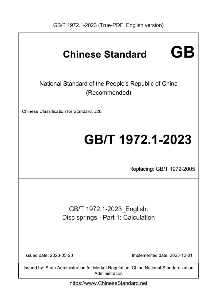 Delivery: <= 5 days. True-PDF full-copy in English will be manually translated and delivered via email. GB/T 1972.1-2023: Disc springs - Part 1: Calculation Status: Valid GB/T 1972.1: Historical versions