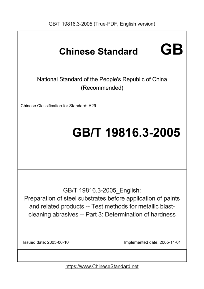 Delivery: <= 3 days. True-PDF full-copy in English will be manually translated and delivered via email. GB/T 19816.3-2005: Preparation of steel substrates before application of paints and related products -- Test methods for metallic blast-cleaning abrasives -- Part 3: Determination of hardness Status: Valid
