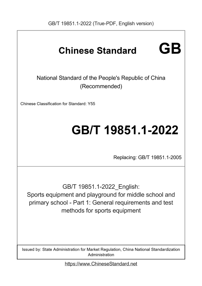 Delivery: <= 4 days. True-PDF full-copy in English will be manually translated and delivered via email. GB/T 19851.1-2022: Sports equipment and playground for middle school and primary school - Part 1: General requirements and test methods for sports equipment Status: Valid GB/T 19851.1: Historical versions