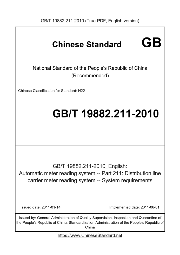 Delivery: <= 3 days. True-PDF full-copy in English will be manually translated and delivered via email. GB/T 19882.211-2010: Automatic meter reading system -- Part 211: Distribution line carrier meter reading system -- System requirements Status: Valid