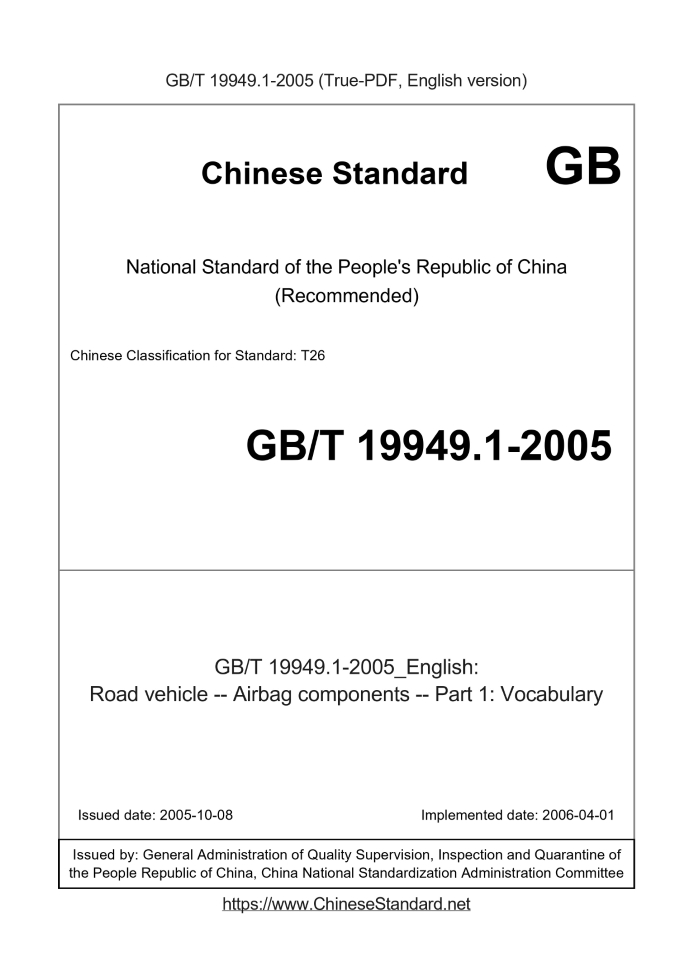 Delivery: <= 4 days. True-PDF full-copy in English will be manually translated and delivered via email. GB/T 19949.1-2005: Road vehicle -- Airbag components -- Part 1: Vocabulary Status: Valid