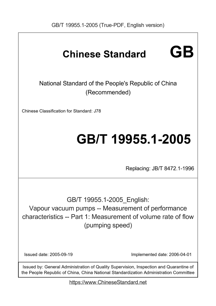 Delivery: <= 3 days. True-PDF full-copy in English will be manually translated and delivered via email. GB/T 19955.1-2005: Vapour vacuum pumps -- Measurement of performance characteristics -- Part 1: Measurement of volume rate of flow (pumping speed) Status: Valid