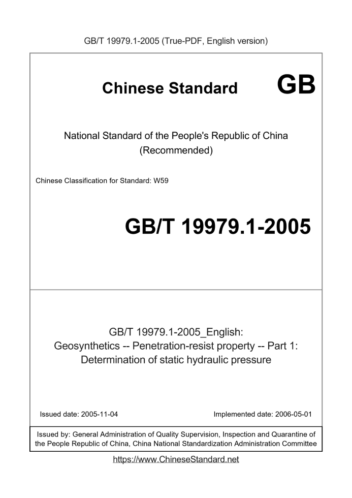 Delivery: <= 3 days. True-PDF full-copy in English will be manually translated and delivered via email. GB/T 19979.1-2005: Geosynthetics -- Penetration-resist property -- Part 1: Determination of static hydraulic pressure Status: Valid