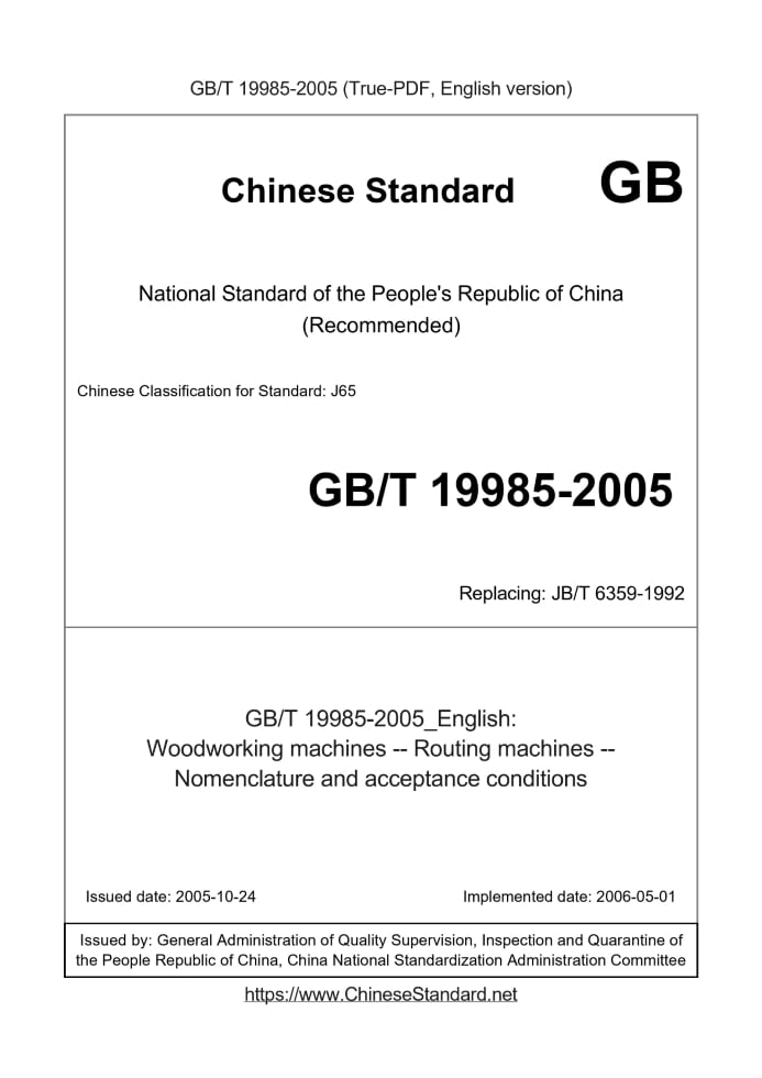 Delivery: <= 3 days. True-PDF full-copy in English will be manually translated and delivered via email. GB/T 19985-2005: Woodworking machines -- Routing machines -- Nomenclature and acceptance conditions Status: Valid