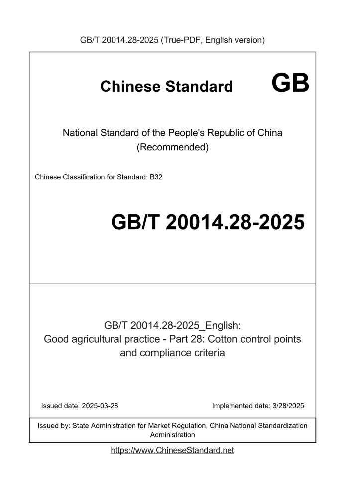 Delivery: <= 3 days. True-PDF full-copy in English will be manually translated and delivered via email. GB/T 20014.28-2025: Good agricultural practice - Part 28: Cotton control points and compliance criteria Status: Valid