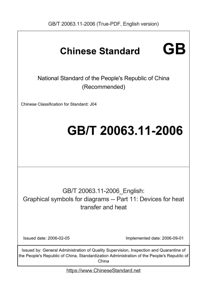 Delivery: <= 3 days. True-PDF full-copy in English will be manually translated and delivered via email. GB/T 20063.11-2006: Graphical symbols for diagrams -- Part 11: Devices for heat transfer and heat Status: Valid