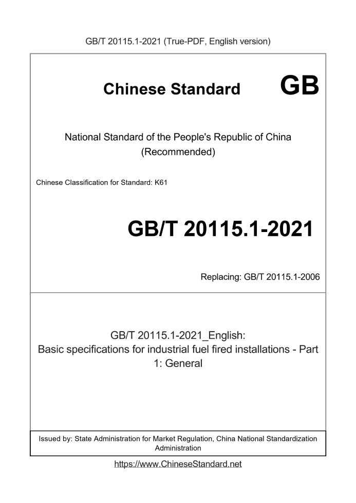Delivery: <= 4 days. True-PDF full-copy in English will be manually translated and delivered via email. GB/T 20115.1-2021: Basic specifications for industrial fuel fired installations - Part 1: General Status: Valid GB/T 20115.1: Historical versions
