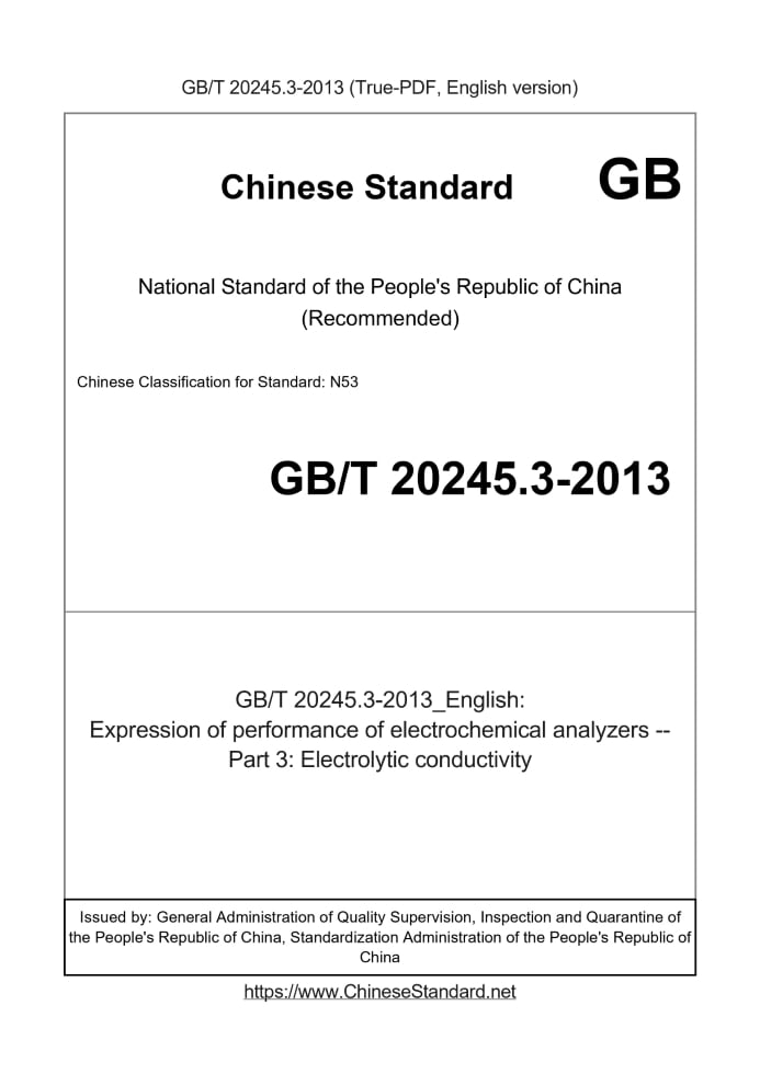 Delivery: <= 3 days. True-PDF full-copy in English will be manually translated and delivered via email. GB/T 20245.3-2013: Expression of performance of electrochemical analyzers -- Part 3: Electrolytic conductivity Status: Valid
