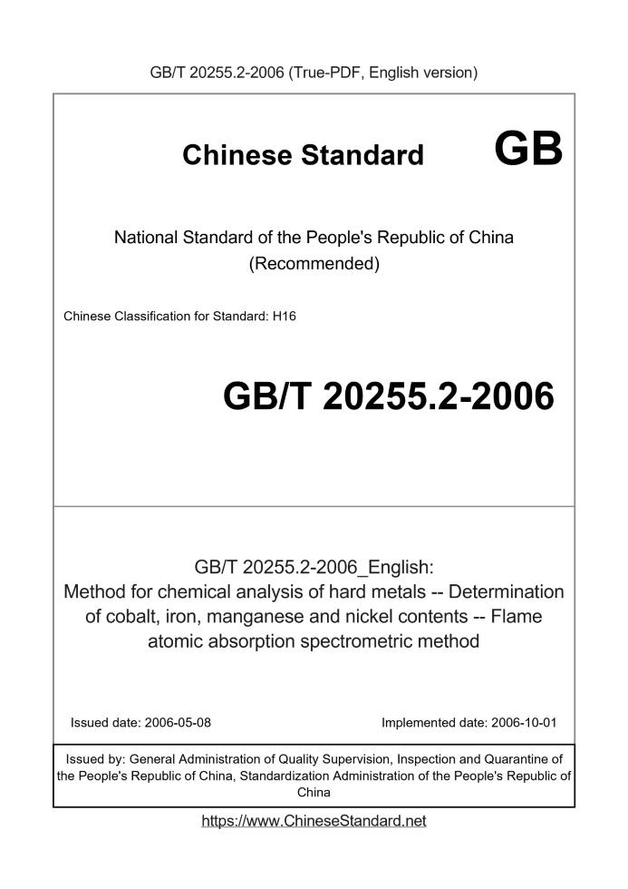 Delivery: <= 3 days. True-PDF full-copy in English will be manually translated and delivered via email. GB/T 20255.2-2006: Method for chemical analysis of hard metals -- Determination of cobalt, iron, manganese and nickel contents -- Flame atomic absorption spectrometric method Status: Valid