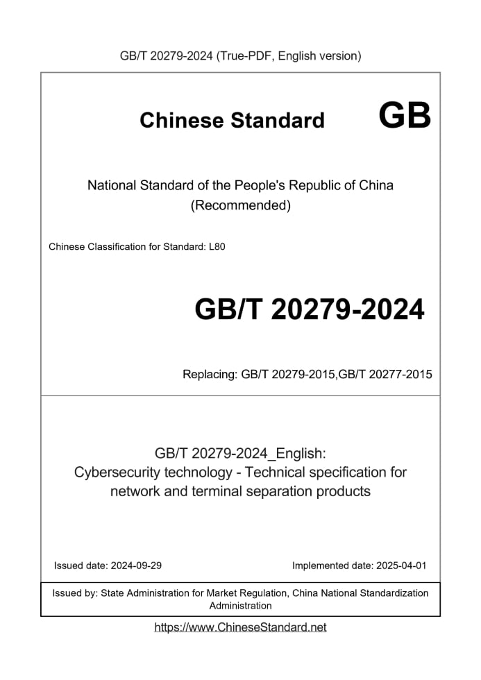 Delivery: <= 7 days. True-PDF full-copy in English will be manually translated and delivered via email. GB/T 20279-2024: Cybersecurity technology - Technical specification for network and terminal separation products Status: Valid GB/T 20279: Historical versions