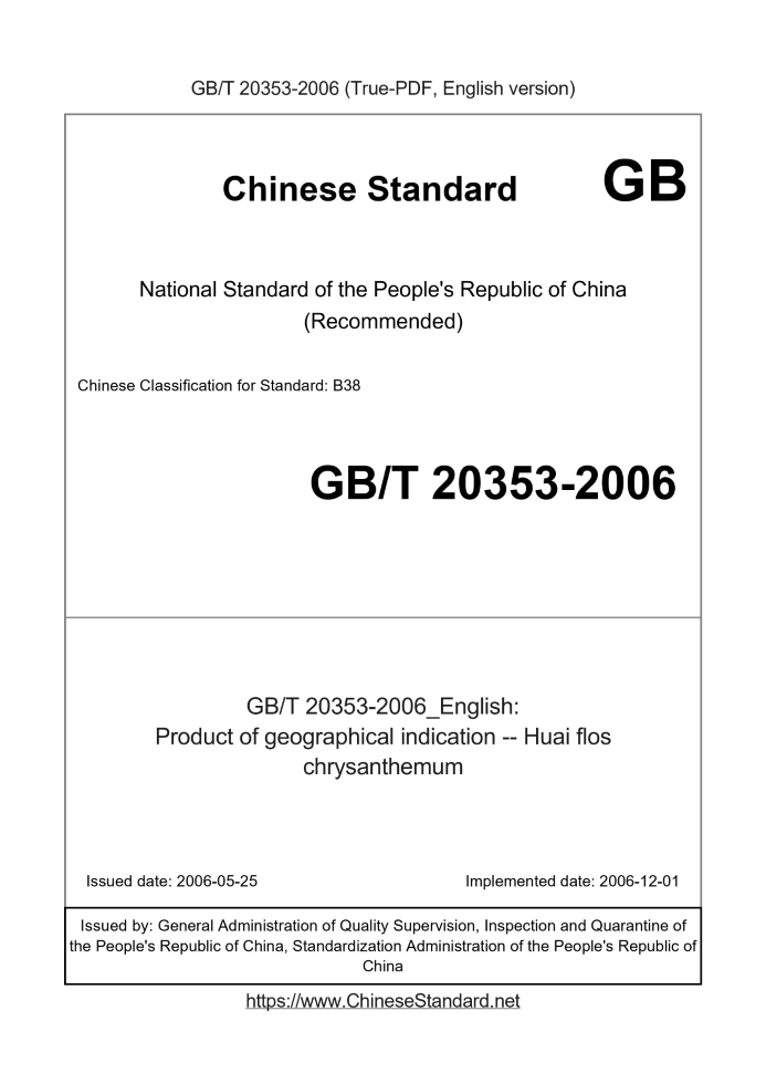 Delivery: <= 3 days. True-PDF full-copy in English will be manually translated and delivered via email. GB/T 20353-2006: Product of geographical indication -- Huai flos chrysanthemum Status: Valid