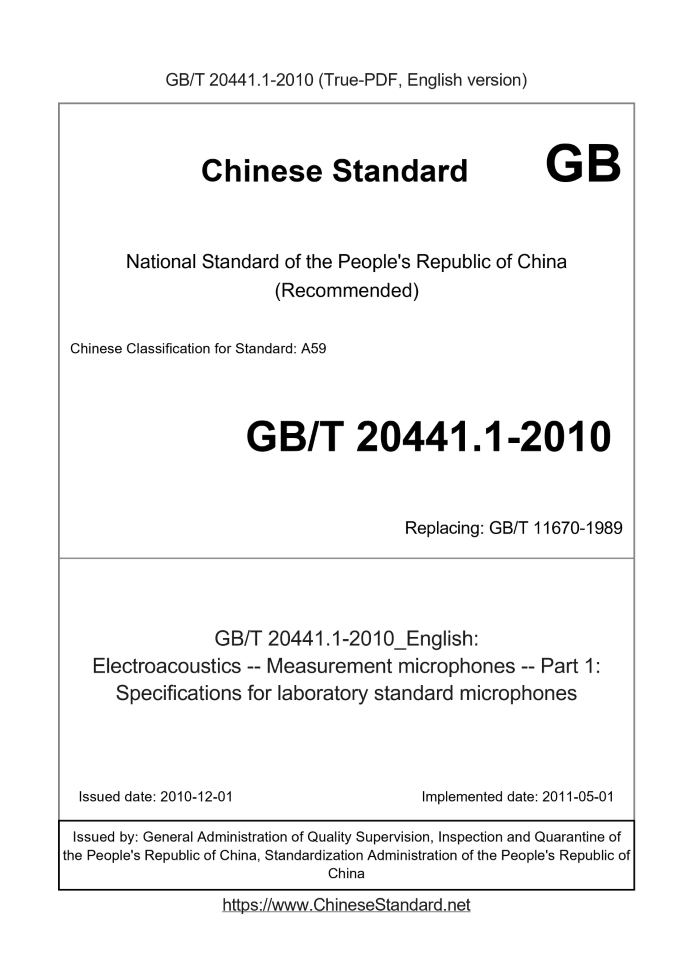 Delivery: <= 3 days. True-PDF full-copy in English will be manually translated and delivered via email. GB/T 20441.1-2010: Electroacoustics -- Measurement microphones -- Part 1: Specifications for laboratory standard microphones Status: Valid