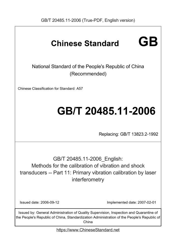Delivery: <= 4 days. True-PDF full-copy in English will be manually translated and delivered via email. GB/T 20485.11-2006: Methods for the calibration of vibration and shock transducers -- Part 11: Primary vibration calibration by laser interferometry Status: Valid