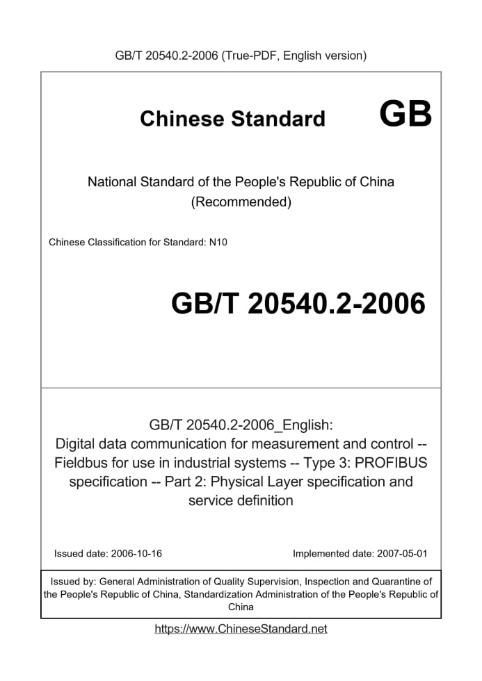 Delivery: <= 13 days. True-PDF full-copy in English will be manually translated and delivered via email. GB/T 20540.2-2006: Digital data communication for measurement and control -- Fieldbus for use in industrial systems -- Type 3: PROFIBUS specification -- Part 2: Physical Layer specification and service definition Status: Valid