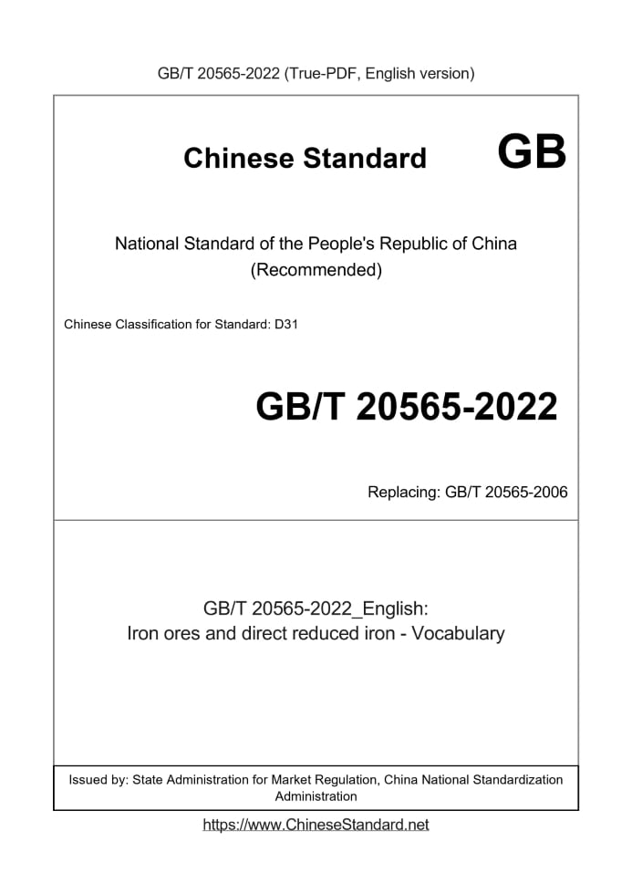 Delivery: <= 6 days. True-PDF full-copy in English will be manually translated and delivered via email. GB/T 20565-2022: Iron ores and direct reduced iron - Vocabulary Status: Valid GB/T 20565: Historical versions