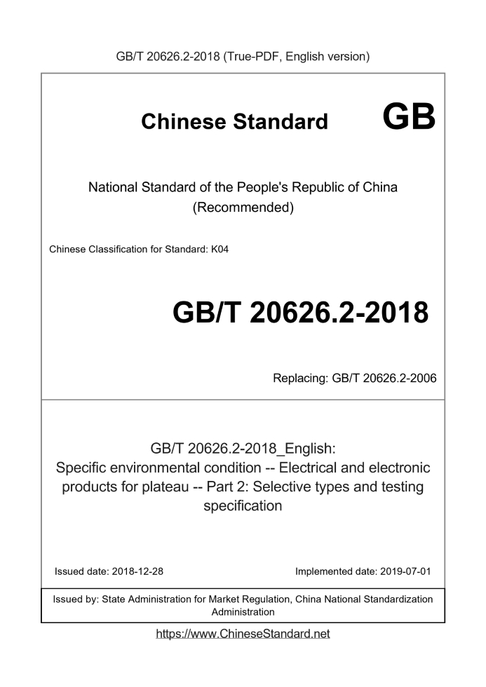Delivery: <= 3 days. True-PDF full-copy in English will be manually translated and delivered via email. GB/T 20626.2-2018: Specific environmental condition -- Electrical and electronic products for plateau -- Part 2: Selective types and testing specification Status: Valid GB/T 20626.2: Historical versions