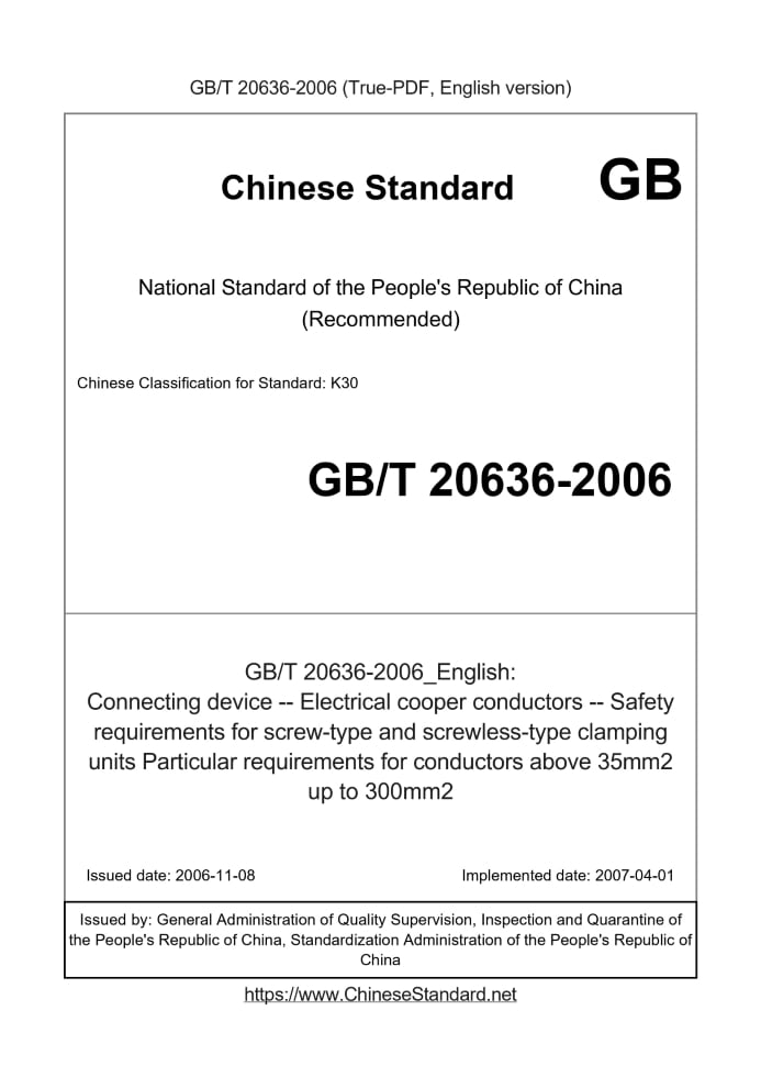 GB/T 20636-2006: Connecting device -- Electrical cooper conductors -- Safety requirements for screw-type and screwless-type clamping units Particular requirements for conductors above 35mm2 up to 300mm2