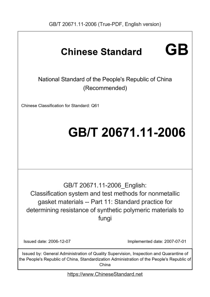| GB/T 20671.11-2006 English PDFUS$194.00 ยท In stock Delivery: <= 3 days. True-PDF full-copy in English will be manually translated and delivered via email. GB/T 20671.11-2006: Classification system and test methods for nonmetallic gasket materials -- Part 11: Standard practice for determining resistance of synthetic polymeric materials to fungi Status: Valid