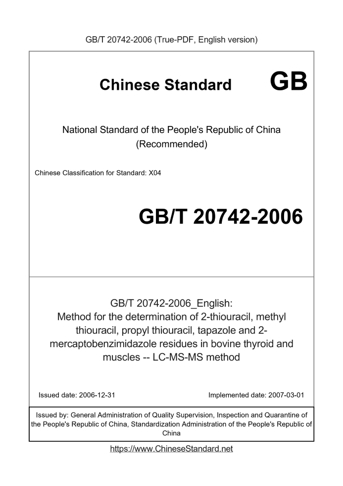 GB/T 20742-2006: Method for the determination of 2-thiouracil, methyl thiouracil, propyl thiouracil, tapazole and 2-mercaptobenzimidazole residues in bovine thyroid and muscles -- LC-MS-MS method