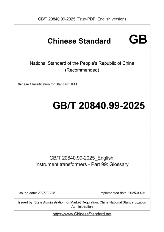 Delivery: <= 7 days. True-PDF full-copy in English will be manually translated and delivered via email. GB/T 20840.99-2025: Instrument transformers - Part 99: Glossary Status: Valid