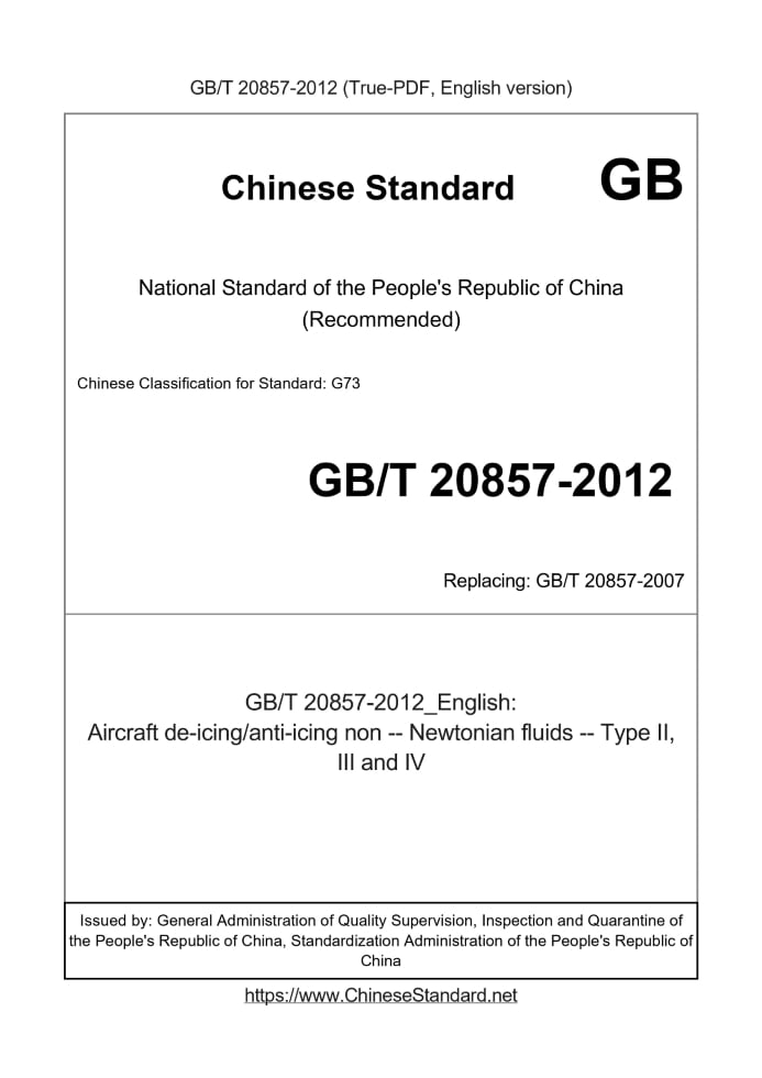 Delivery: <= 4 days. True-PDF full-copy in English will be manually translated and delivered via email. GB/T 20857-2012: Aircraft de-icing/anti-icing non -- Newtonian fluids -- Type II, III and IV Status: Valid GB/T 20857: Historical versions