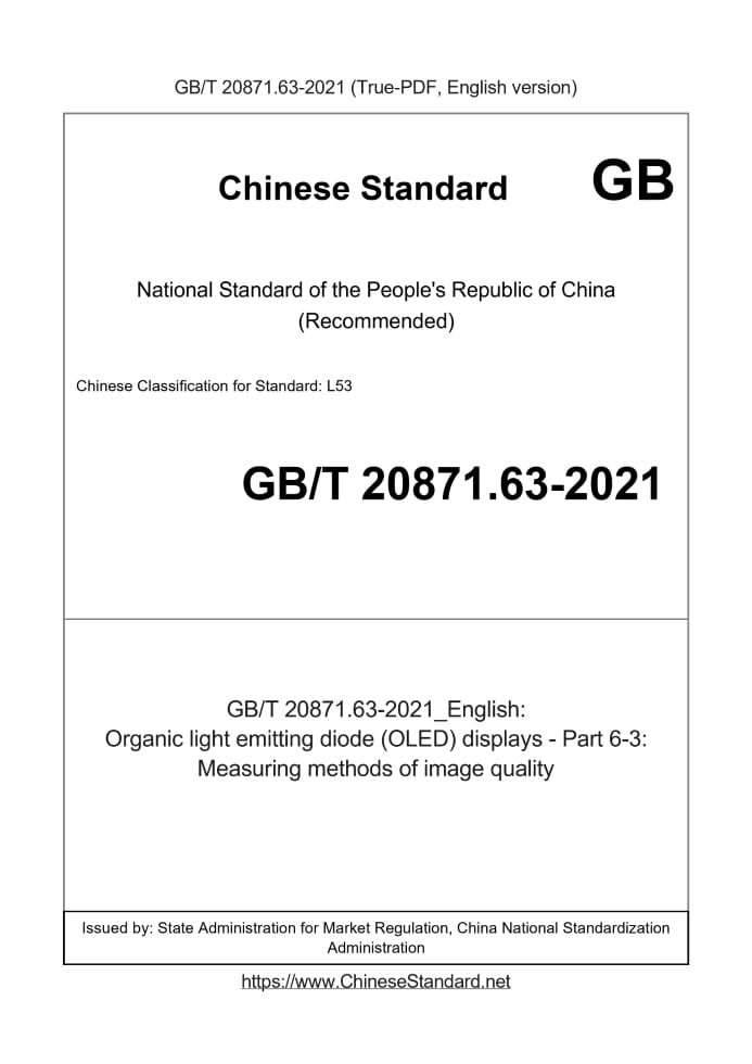 Delivery: <= 3 days. True-PDF full-copy in English will be manually translated and delivered via email. GB/T 20871.63-2021: Organic light emitting diode (OLED) displays - Part 6-3: Measuring methods of image quality Status: Valid