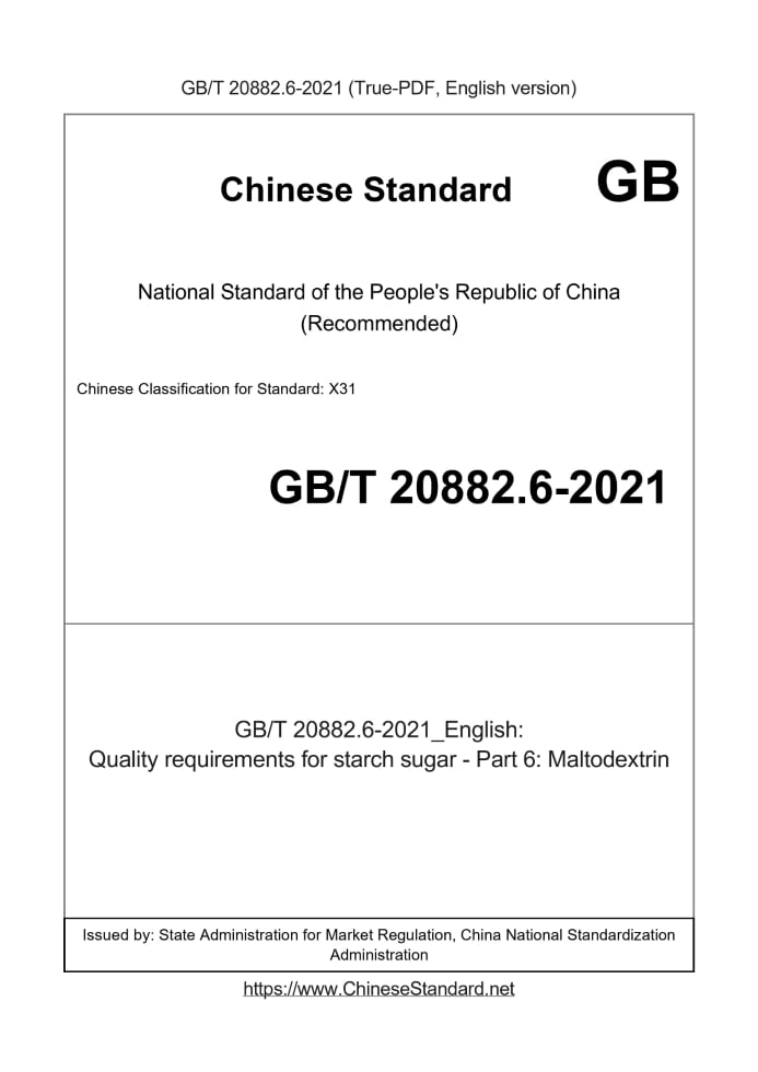 Delivery: <= 3 days. True-PDF full-copy in English will be manually translated and delivered via email. GB/T 20882.6-2021: Quality requirements for starch sugar - Part 6: Maltodextrin Status: Valid