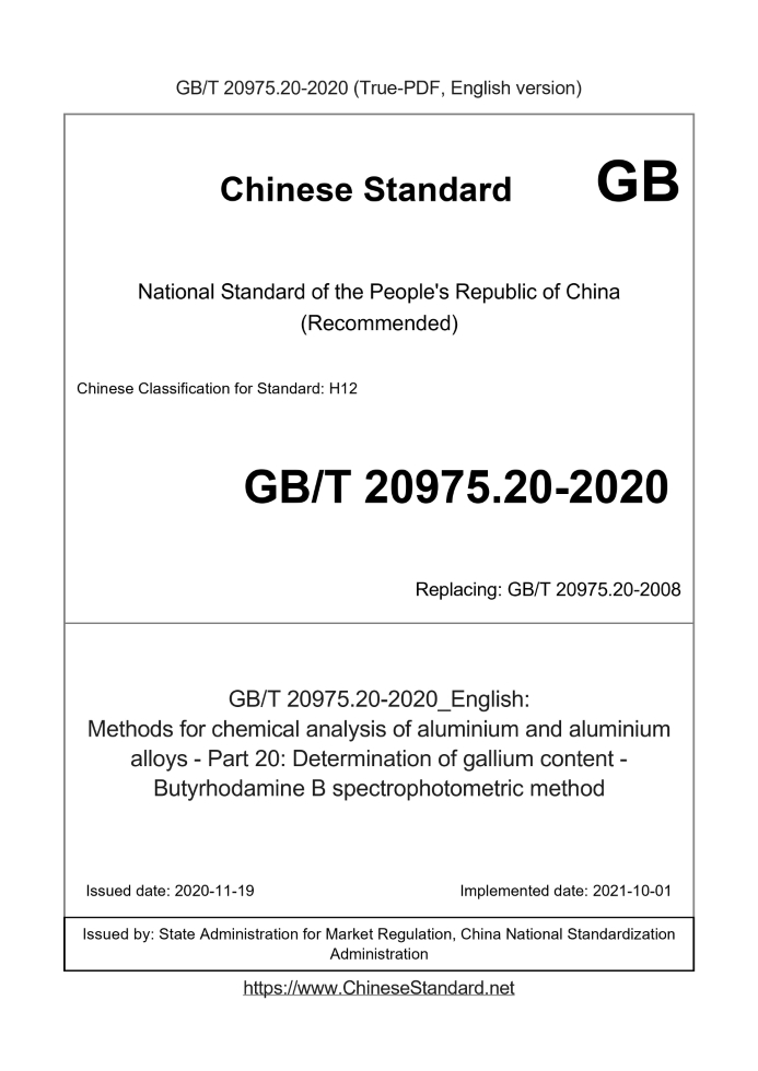 Delivery: <= 3 days. True-PDF full-copy in English will be manually translated and delivered via email. GB/T 20975.20-2020: Methods for chemical analysis of aluminium and aluminium alloys - Part 20: Determination of gallium content - Butyrhodamine B spectrophotometric method Status: Valid GB/T 20975.20: Historical versions