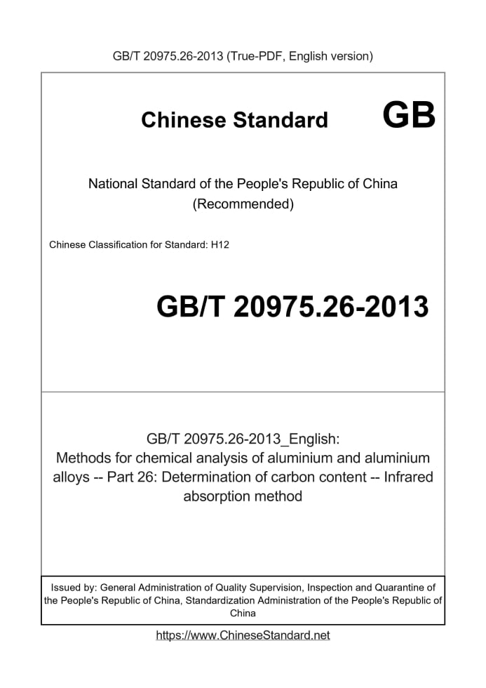 Methods for chemical analysis of aluminium and aluminium alloys Part 26... Determination of carbon content Infrared absorption method ICS 77.120.20 H12 National Standards of People's Republic of China Methods for chemical analysis of aluminum and aluminum alloys Part 26. Determination of carbon content by infrared absorption method Part 26. Determinationofcarboncontent-Infraredabsorptionmethod Issued on. 2013-11-27 2014-08-01 implementation Administration of Quality Supervision, Inspection and Quarantine of People's Republic of China Standardization Administration of China released
