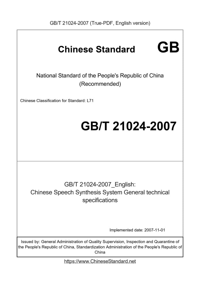 Delivery: <= 6 days. True-PDF full-copy in English will be manually translated and delivered via email. GB/T 21024-2007: Chinese Speech Synthesis System General technical specifications Status: Valid