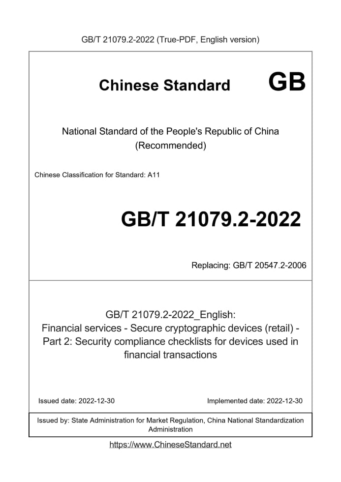 Delivery: <= 6 days. True-PDF full-copy in English will be manually translated and delivered via email. GB/T 21079.2-2022: Financial services - Secure cryptographic devices (retail) - Part 2: Security compliance checklists for devices used in financial transactions Status: Valid