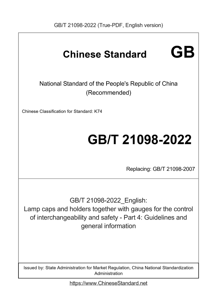 Delivery: <= 6 days. True-PDF full-copy in English will be manually translated and delivered via email. GB/T 21098-2022: Lamp caps and holders together with gauges for the control of interchangeability and safety - Part 4: Guidelines and general information Status: Valid GB/T 21098: Historical versions