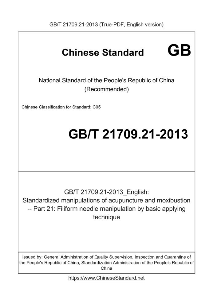 Delivery: <= 3 days. True-PDF full-copy in English will be manually translated and delivered via email. GB/T 21709.21-2013: Standardized manipulations of acupuncture and moxibustion -- Part 21: Filiform needle manipulation by basic applying technique Status: Valid