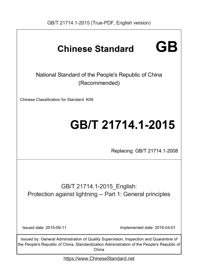 Delivery: <= 6 days. True-PDF full-copy in English will be manually translated and delivered via email. GB/T 21714.1-2015: Protection against lightning -- Part 1: General principles Status: Valid GB/T 21714.1: Historical versions