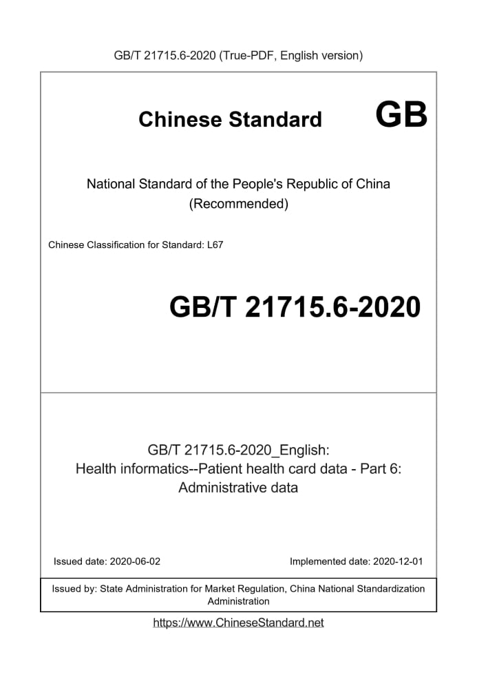 Delivery: <= 3 days. True-PDF full-copy in English will be manually translated and delivered via email. GB/T 21715.6-2020: Health informatics--Patient health card data - Part 6: Administrative data Status: Valid