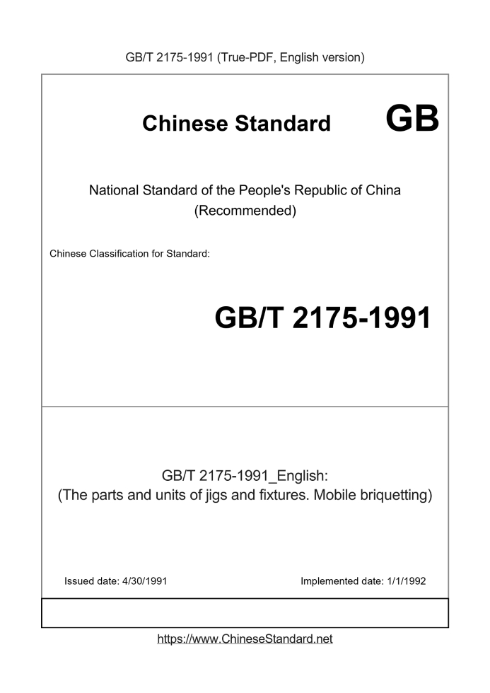 Delivery: <= 2 days. True-PDF full-copy in English will be manually translated and delivered via email. GB/T 2175-1991: (The parts and units of jigs and fixtures. Mobile briquetting) Status: Obsolete