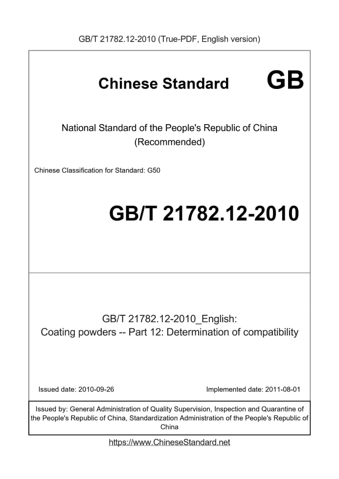 Delivery: <= 3 days. True-PDF full-copy in English will be manually translated and delivered via email. GB/T 21782.12-2010: Coating powders -- Part 12: Determination of compatibility Status: Valid