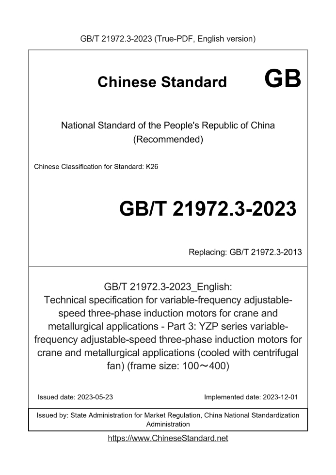 Delivery: <= 5 days. True-PDF full-copy in English will be manually translated and delivered via email. GB/T 21972.3-2023: Technical specification for variable-frequency adjustable-speed three-phase induction motors for crane and metallurgical applications - Part 3: YZP series variable-frequency adjustable-speed three-phase induction motors for crane and metallurgical applications (cooled with centrifugal fan) (frame size: 100~400) Status: Valid GB/T 21972.3: Historical versions
