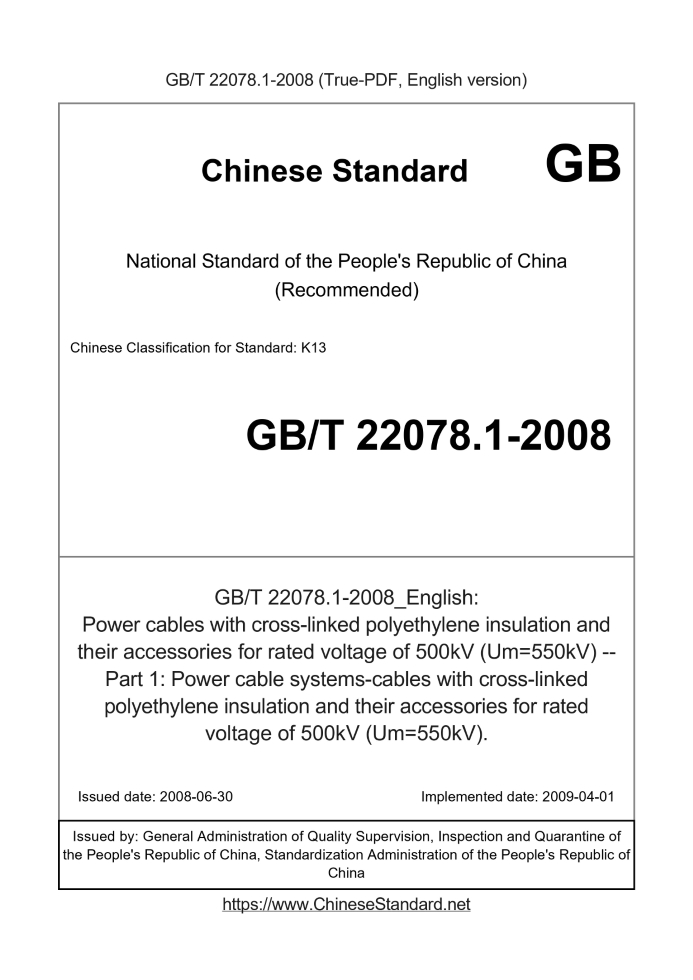 Delivery: <= 6 days. True-PDF full-copy in English will be manually translated and delivered via email. GB/T 22078.1-2008: Power cables with cross-linked polyethylene insulation and their accessories for rated voltage of 500kV (Um=550kV) -- Part 1: Power cable systems-cables with cross-linked polyethylene insulation and their accessories for rated voltage of 500kV (Um=550kV). Status: Valid