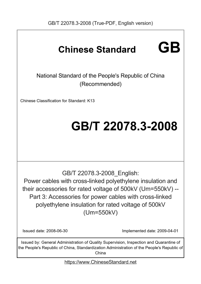 Delivery: <= 3 days. True-PDF full-copy in English will be manually translated and delivered via email. GB/T 22078.3-2008: Power cables with cross-linked polyethylene insulation and their accessories for rated voltage of 500kV (Um=550kV) -- Part 3: Accessories for power cables with cross-linked polyethylene insulation for rated voltage of 500kV (Um=550kV) Status: Valid