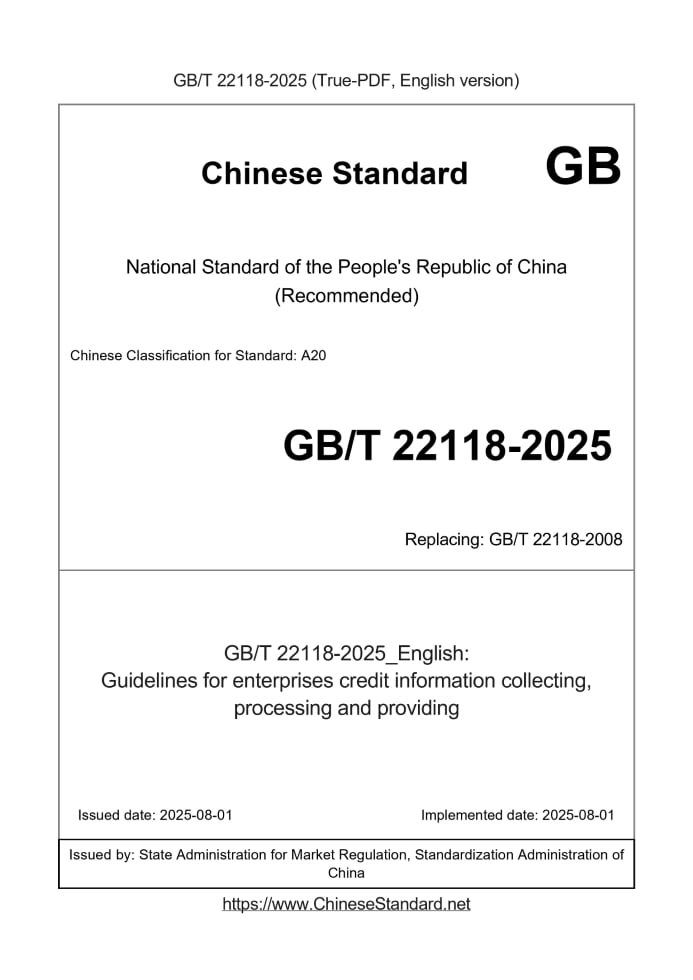 Basic dataStandard ID: GB/T 22118-2025 (GB/T22118-2025)Description (Translated English): Guidelines for enterprises credit information collecting, processing and providing Sector / Industry: National Standard (Recommended) Classification of Chinese Standard: A20 Classification of International Standard: 03.080.99 Word Count Estimation: 10,199 Date of Issue: 2025-08-01 Date of Implementation: 2025-08-01 Older Standard (superseded by this standard): GB/T 22118-2008 Issuing agency(ies): State Administration for Market Regulation, Standardization Administration of China GB/T 22118-2025: Guidelines for enterprises credit information collecting, processing and providing---This is an excerpt. Full copy of true-PDF in English version (including equations, symbols, images, flow-chart, tables, and figures etc.), auto-downloaded/delivered in 9 seconds, can be purchased online: https://www.ChineseStandard.net/PDF.aspx/GBT22118-2025 ICS 03.080.99 CCSA20 National Standard of the People's Republic of China Replaces GB/T 22118-2008 Guidelines for the Collection, Processing and Provision of Corporate Credit Information Released on August 1, 2025 Implementation on August 1, 2025 State Administration for Market Regulation The National Standardization Administration issued Table of ContentsPreface III Introduction IV 1 Scope 1 2 Normative references 1 3 Terms and Definitions 1 4 Basic Principles 1 4.1 Compliance 1 4.2 Consistency 1 4.3 Independence 2 4.4 Accuracy 2 4.5 Timeliness 2 5 Enterprise Credit Information Collection 2 5.1 General Principles 2 5.2 Information Sources 2 5.3 Collection Method 2 5.4 Collection Method 2 5.5 Collection range 3 6 Enterprise Credit Information Processing 3 6.1 General Principles 3 6.2 Treatment Method 3 7 Enterprise credit information provision 4 7.1 General Principles 4 7.2 Provision Method 4 7.3 Objection Handling, Supervision and Reporting 4 References 5 Preface This document is in accordance with the provisions of GB/T 1.1-2020 "Guidelines for standardization work Part 1.Structure and drafting rules for standardization documents" Drafting. This document replaces GB/T 22118-2008 "Specifications for the Collection, Processing and Provision of Enterprise Credit Information" and is consistent with GB/T 22118-2008. In addition to structural adjustments and editorial changes, the main technical changes are as follows. a) The "Scope" has been changed (see Chapter 1, Chapter 1 of the.2008 edition); b) “Terms and Definitions” has been modified (see Chapter 3, Chapter 3 of the.2008 edition); c) The “Basic Principles” have been modified (see Chapter 4, Chapter 4 of the.2008 edition); d) "Collection of Enterprise Credit Information" has been modified (see Chapter 5, Chapter 5 of the.2008 edition); e) "Enterprise Credit Information Processing" has been modified (see Chapter 6, Chapter 6 of the.2008 edition); f) "Provision of Enterprise Credit Information" has been modified (see Chapter 7, Chapter 7 of the.2008 edition); g) “Basic Information”, “Business Management Information” and “Bank Transaction Information” have been deleted (see Appendix A, Appendix B and Appendix C of the.2008 edition). Please note that some of the contents of this document may involve patents. The issuing organization of this document does not assume the responsibility for identifying patents. This document was proposed and coordinated by the National Social Credit Standardization Technical Committee (SAC/TC470). This document was drafted by. China National Institute of Standardization, State Administration for Market Regulation, Zhejiang Provincial Administration for Market Regulation, China Network Security Bureau The National Audit and Certification and Market Supervision Big Data Center, the Inner Mongolia Autonomous Region Big Data Center, the Hubei Provincial Standardization and Quality Research Institute, the Hangzhou Economic and Economic Information Center (Hangzhou Credit Center), Pingdingshan High-tech Industrial Development Zone, Yongdao Technology Co., Ltd., Zhushan County Data Bureau, China Minsheng Bank Institute of Aeronautical Science and Technology, China University of Jiliang, Nankai University, Qijiayoudao Network Technology (Beijing) Co., Ltd., Zhengzhou Zhenghaorong Credit Information Service Co., Ltd., Wuhan Shudao Information Technology Co., Ltd., Sichuan Jinxu Business Consulting Co., Ltd., China Aerospace Science and Industry Corporation, Aerospace Science and Industry Network Information Development Co., Ltd., Bazhou Cairui Financial Investment Management Co., Ltd., Hangzhou Shulan Technology Co., Ltd., Wuhan Shuyi Intelligent Technology Co., Ltd., National Reform Credit Management (Beijing) Co., Ltd., and Shenzhen Power Supply Bureau Co., Ltd. The main drafters of this document are. Zhao Yan, Lei Guangcheng, Zhou Li, Zhang Honghua, Miao Xiaofeng, Shi Zhan, Jiang Zhou, Yan Xiaoliang, Li Xianghua, Huang Rong, Meng Cuizhu, Wang Chao, Sun Guoquan, Wang Liyuan, Li Xiuping, Cai Huali, Lai Minghua, Zhao Suhua, Wang Jing, Yu Dadong, Li Shu, Xu Ran, Zhou Mingxing, Ye Ruyi, Wang Zhiyuan, Sun He, Liu Xia, Jia Yue, Wang Ning, Lin Yunfeng, Zhou Kai, Zhao Donghui, Liu Yong, Zou Zhenjun, Zhang Xin, Zhang Yongfang, Chang Xinglong, Zhao Xiaobin, Liu Cuiping, Xie Hong, Cai Guoyong, Wang Gang, Sun Yongquan, Du Xiaotian, Zhao Wanting, and Yin Xiao. The previous versions of this document and the documents it replaces are as follows. ---First published in.2008 as GB/T 22118-2008; ---This is the first revision.introductionEffectively collect and integrate credit information in accordance with laws and regulations, establish a unified platform, realize the sharing of credit information resources and its application in various fields of economy and society The application of the domain is the foundation of the entire social credit system construction, and it is also an important task to strengthen the credit construction of enterprises. In the process of building a new pattern of social