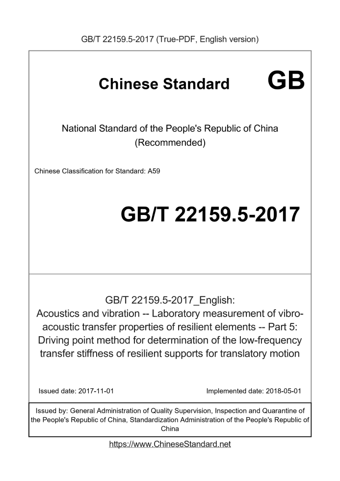 Delivery: <= 4 days. True-PDF full-copy in English will be manually translated and delivered via email. GB/T 22159.5-2017: Acoustics and vibration -- Laboratory measurement of vibro-acoustic transfer properties of resilient elements -- Part 5: Driving point method for determination of the low-frequency transfer stiffness of resilient supports for translatory motion Status: Valid